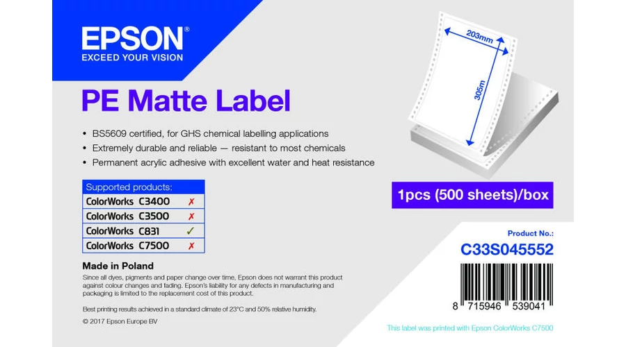 Epson S045552 fehér matt eredeti címketekercs (500 címke, 203x305mm)